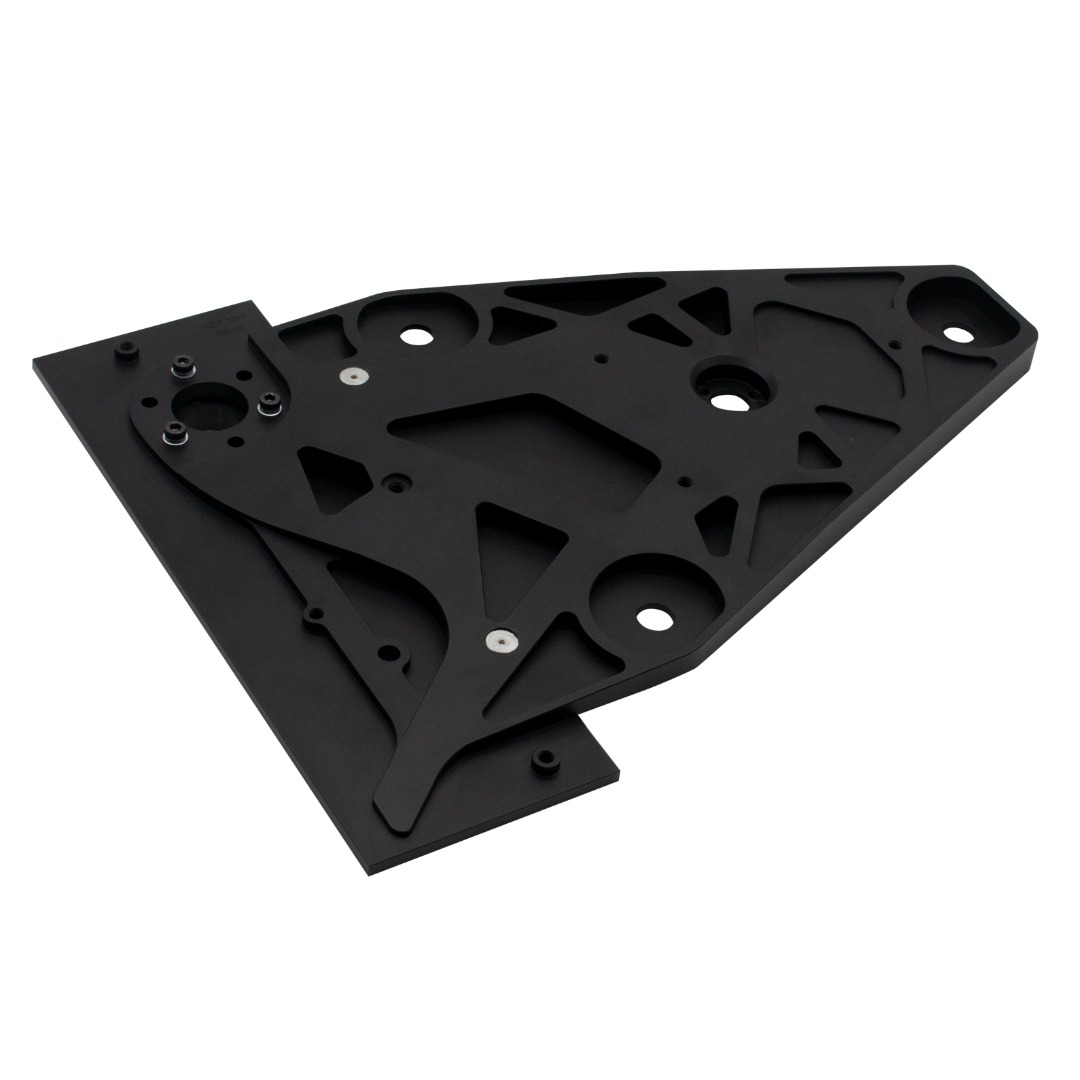 By machining aluminium from calculated areas beneath the armboard, Keel SE has its centre of mass balanced more evenly on its suspension compared to other sub-chassis models. This improves weight distribution between the springs and reduces inertia, improving the critical acoustic isolation properties of any LP12.