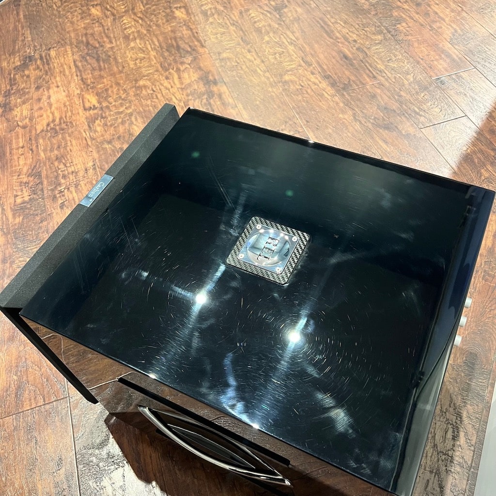 As shown in the photo, the top of the subwoofer has some typical marks that can occur with this type of Gloss finish. They’re only visible in the right light, and I’ve tried to capture them in the picture as best as possible.